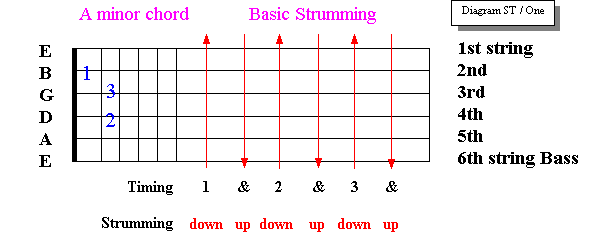 Try the strum with a chord such as A minor as shown below. Later try strumming & changing to other chords