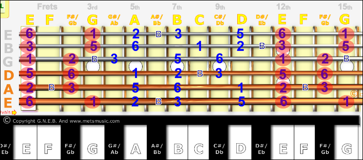 All of the Blue numbers shown above (and the B) for the G Major Pentatonic and / or the E Minor Pentatonic scale will work