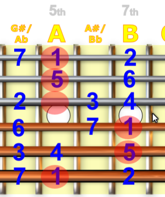 Here in picture 3 below you can see the A Major Scale shown with all the Blue Numbers 1-