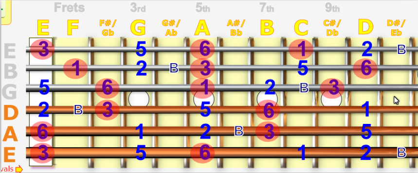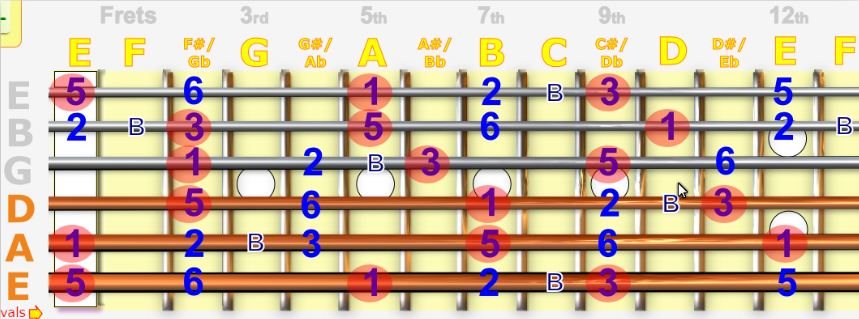 The BLUE Numbers are the notes for the A major Pentatonic (also known as the F# minor Pentatonic)