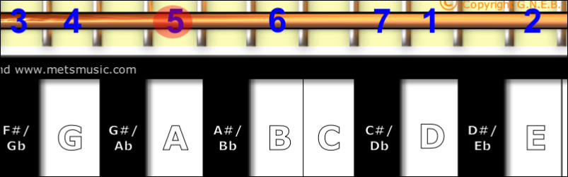 All the Blue Numbers show the notes of the A Mixolydian Mode all over the neck of the Guitar and across the Keyboard too